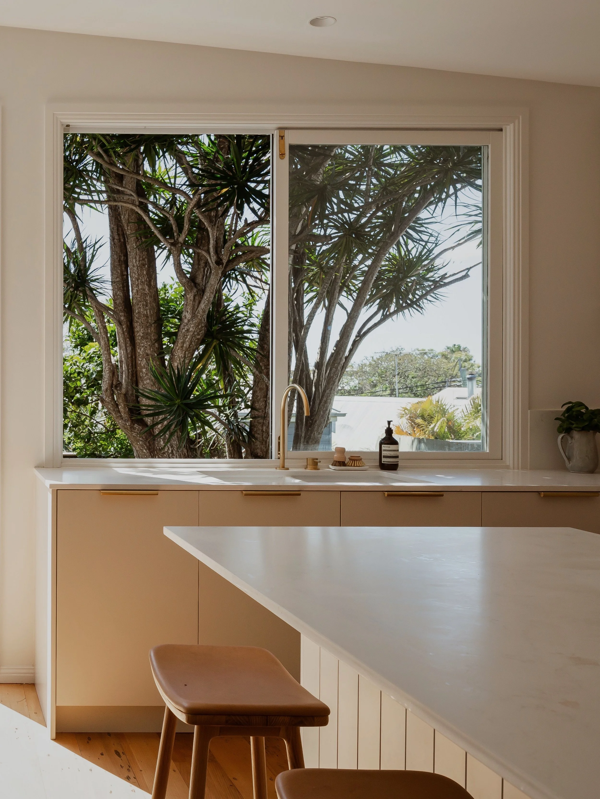One of the oldest trees in my garden, a huge Madagascar dragon tree, became the focal point of our kitchen design. We installed a large glass sliding window right in front of it, creating the effect of the tree almost becoming part of the kitchen itself. It transformed into a space that feels deeply connected to its surroundings, and it shifts with the movement of light throughout the day.